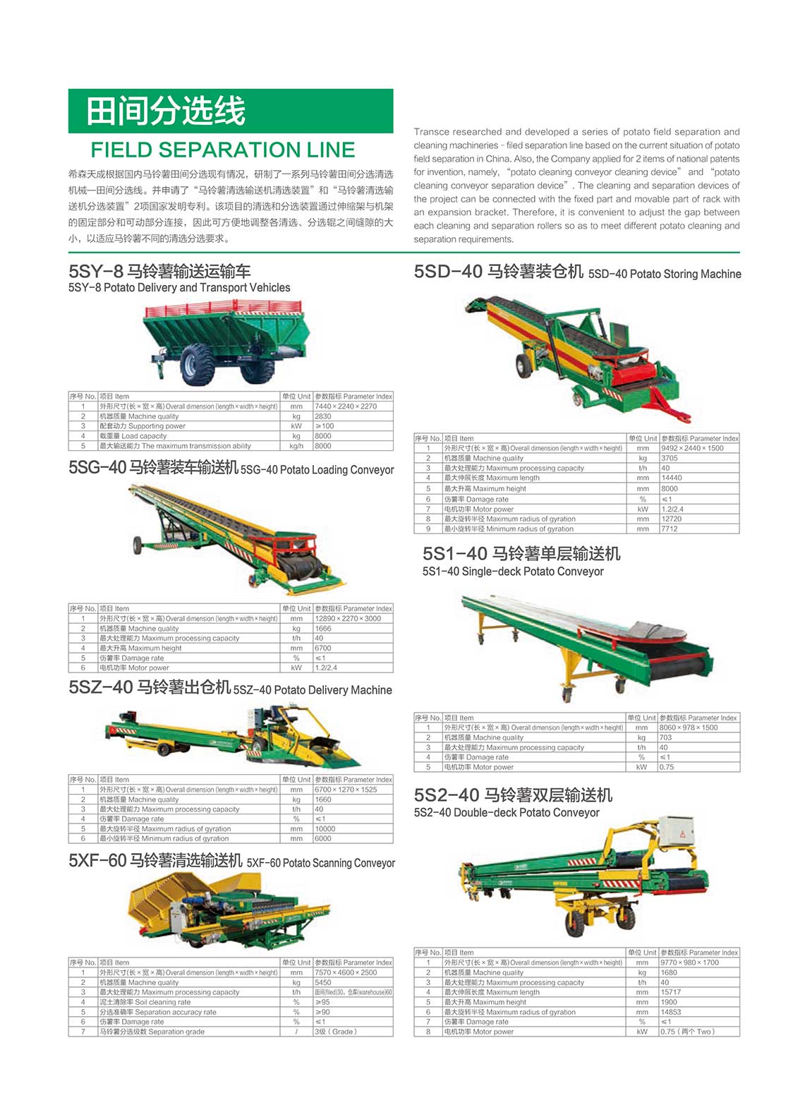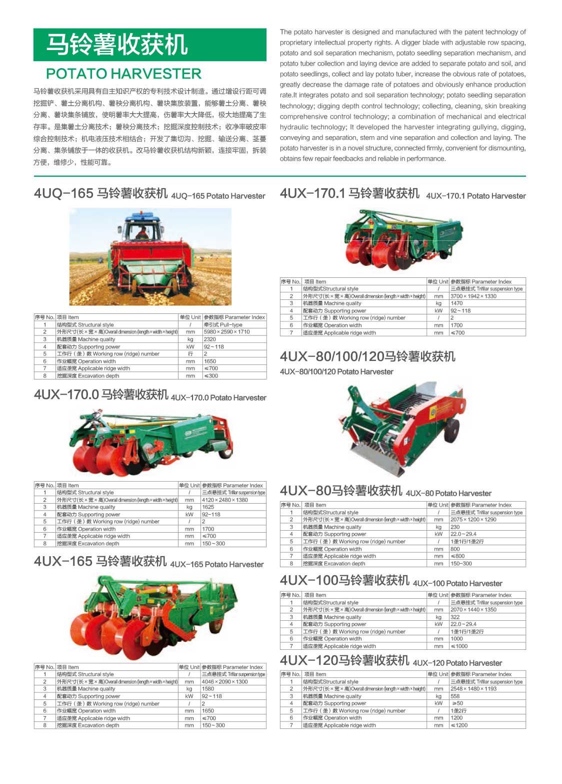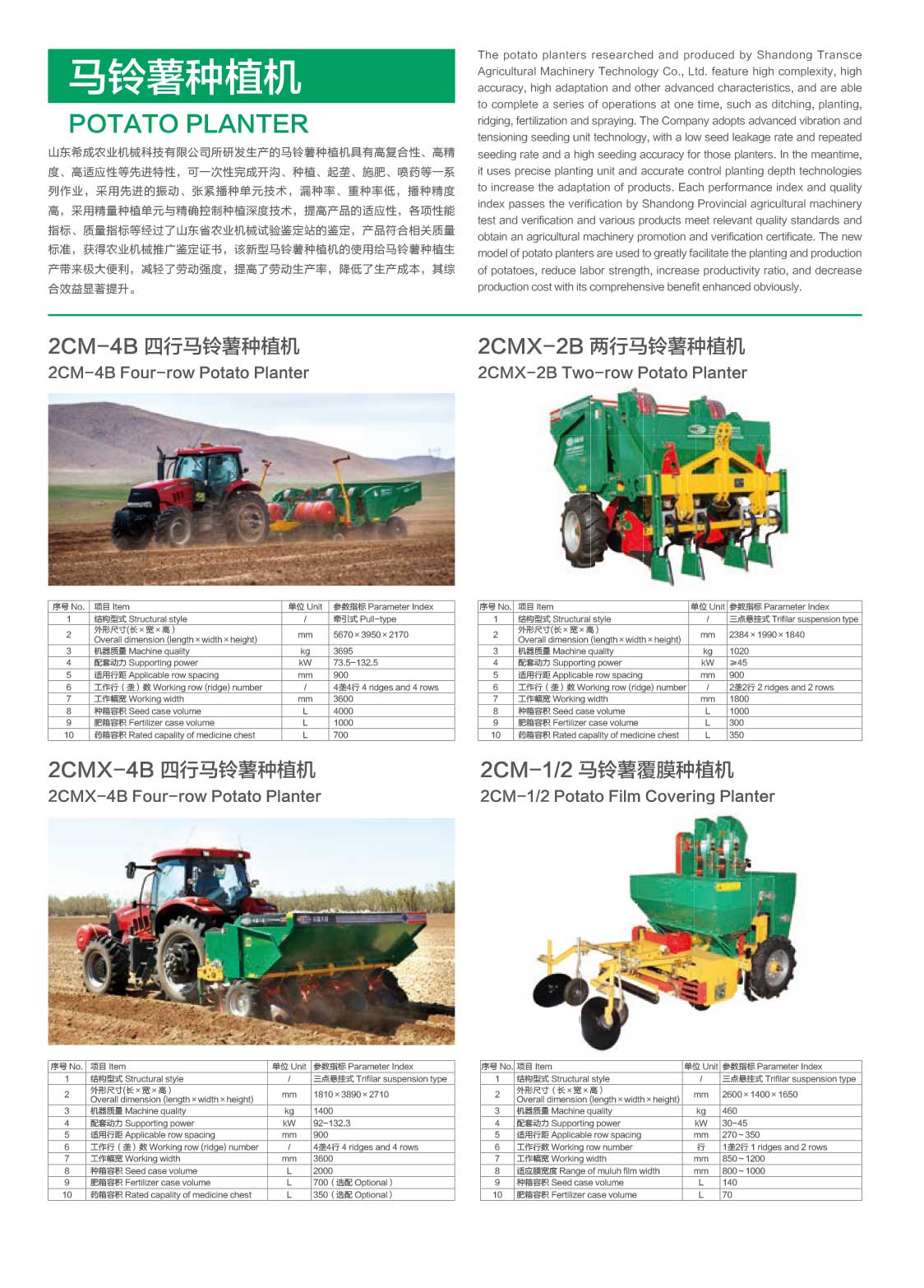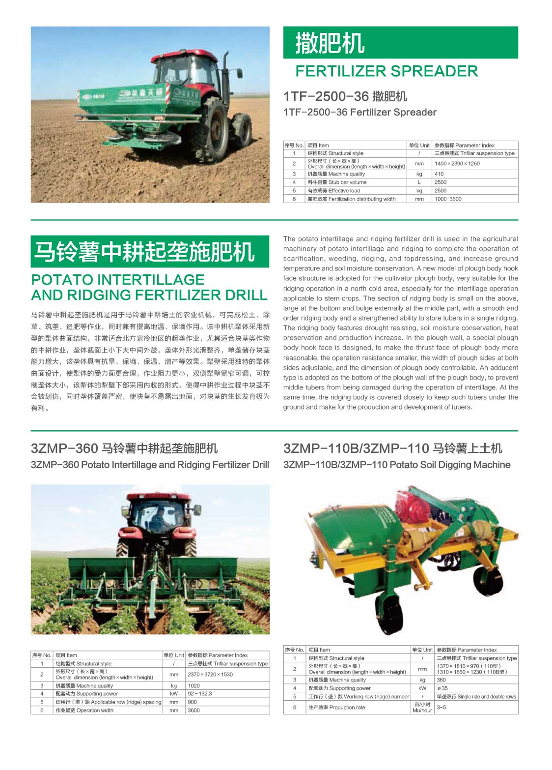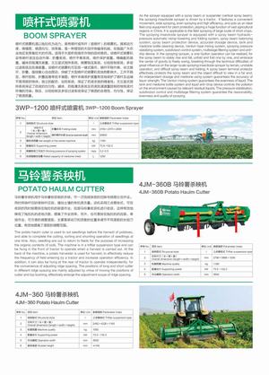 公司現(xiàn)已開(kāi)發(fā)出耕整機(jī)機(jī)械、馬鈴薯種植機(jī)、中耕起壟施肥機(jī)、噴桿式噴藥機(jī)、殺秧機(jī)、收獲機(jī)及輸送清選機(jī)等一系列馬鈴薯種植機(jī)械,擁有7大系列,30多項(xiàng)產(chǎn)品。