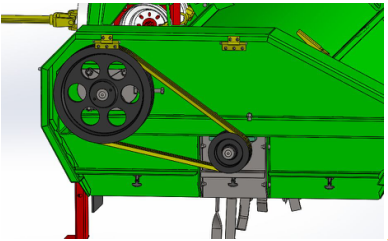 拖拉機通過傳動軸將動力傳至變速箱,變速箱通過左右兩邊的傳動軸將動力傳至兩邊的大皮帶輪,大皮帶輪通過皮帶傳至小皮帶輪,小皮帶輪帶動殺秧軸進行殺秧。