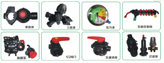 噴霧控制系統:噴霧控制系統主要由球閥、調壓閥、分配器、過濾器、攪拌器、噴頭、壓力表、PVC管、膠管等組成,其主要用來控制噴霧量、噴霧壓力、加水、加藥、攪拌、清洗等。具體操作詳見作業前與作業過程中的調整。